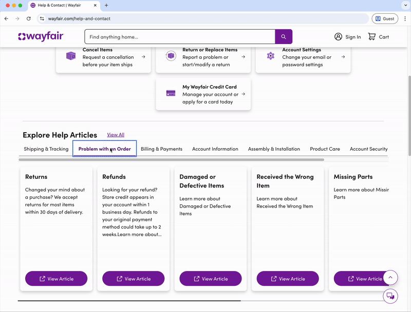 Furniture ecommerce company Wayfair has a knowledge base that stands out with a well-designed homepage.