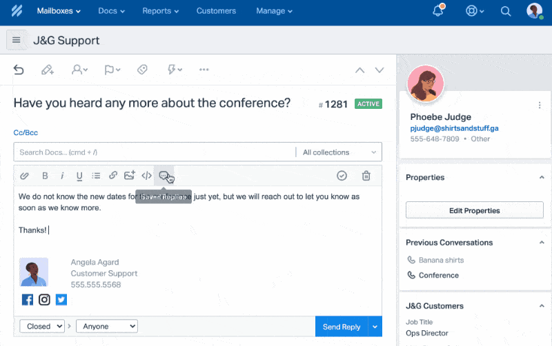 Head over to Manage > Mailboxes, click on a mailbox, then click Saved Replies from the left-hand sidebar.